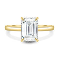 The Dawn engagement ring presents a timeless emerald-cut solitaire, secured by four eagle-tipped claws and poised atop a sleek, minimalist band for a sophisticated and enduring design.